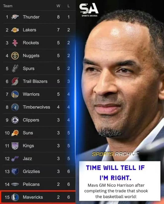 尼克还说过:时间会证明他的决策是正确的。我不知道是不是现在时间还没到,但我只看到浓眉伤停,弗拉格挣扎,独行侠垫底...ESPN记者麦克马洪在播客节目中表示:球队灾难性的开局让联盟各方开始质疑,篮球运营总裁尼克哈里森是否可能会被提前解雇